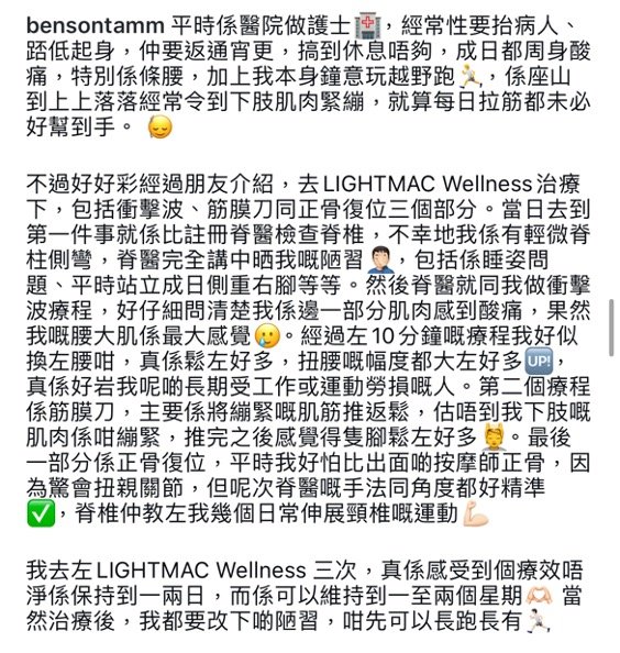 哥哥好鍾意踢波⚽️平時做訓練時,慣性只係用同一隻腳嚟踢,所以令單側肌肉過度使用,引致骨盤唔對稱、脊柱側彎、出現長短腳、仲有高低膊😖所以即刻帶哥哥s黎到✨LIGHTMAC Wellness✨搵專業醫護團隊幫幫手🥹發現問題後,即時幫哥哥s做左復位治療👍🏽醫生幾下動作,完全唔痛,長短腳問題已經解決😳👏🏼